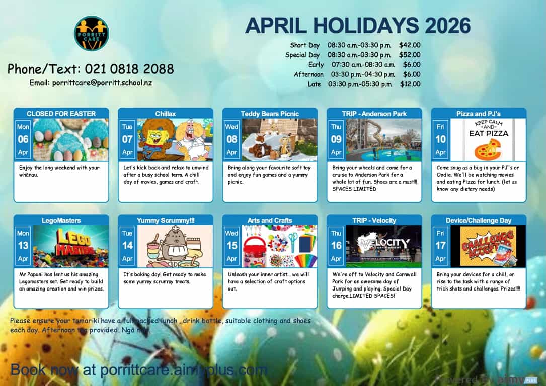 PorrittCare has been established to support the tamariki and whānau of Porritt School. We don't currently invite enrolments from outisde our school community.